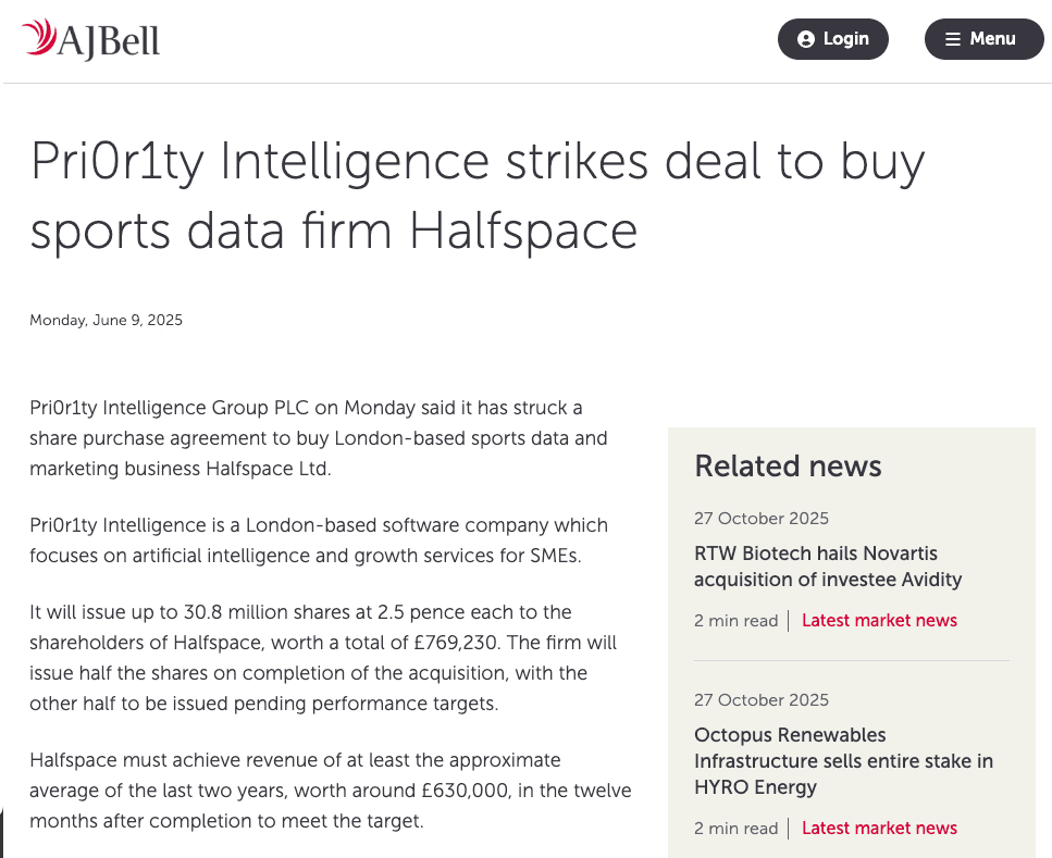 Pri0r1ty Intelligence Group PLC on Monday said it has struck a share purchase agreement to buy London-based sports data and marketing business Halfspace Ltd.