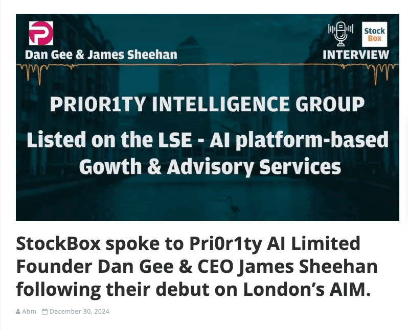 StockBox spoke to Pri0r1ty AI Limited Founder Dan Gee & CEO James Sheehan following their debut on London’s AIM.
